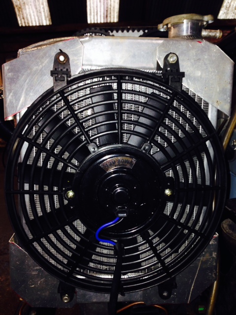 The approach to use an electric cooling fan was taken due to space requirements for the hose work from the head end plate drains to the rear oil return manifold. Measurements were taken and the largest cooling fan was ordered that would fit onto the rear side of the alloy rad. The original front cowling was retained and the mounting positions used to mount up some mounting brackets so that the fan would fit up against the radiator.