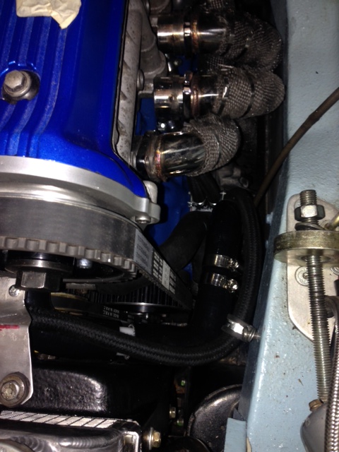 The conversion gets a little complicated trying to pipe up all of the required lines in so little space. Also having an exposed cam belt running within around 15mm away from a radiator bottom hose can be a little daunting. We now have 2 10mm drain lines, a 25mm drain line from head to block sump. A block breather, a head breather and the modified bottom and top radiator hoses. The hoses that i used for the head drain lines need to be a minimum of 3/8″ or 10mm. The head main drain is 25mm. I used black silicone hoses for the oil and water applications on the engine with nylon hose joiners. A selection of 90, 45 and 180 formed hoses were used to hose up the engine.